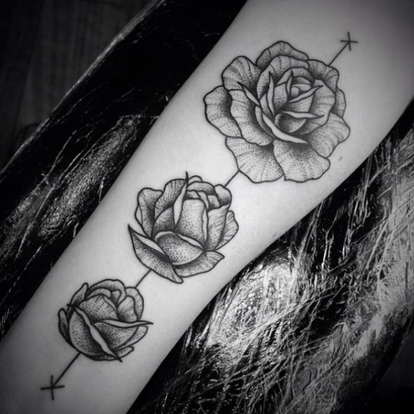 小臂黑灰三朵不同程度玫瑰花纹身图案