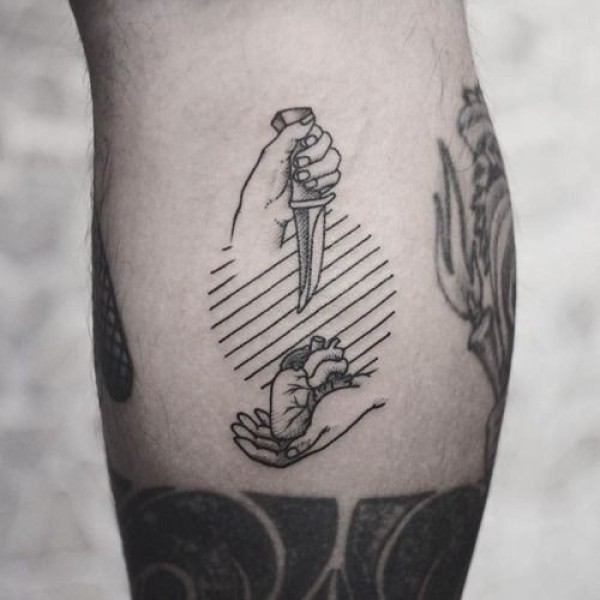 小腿简单手绘黑色手与匕首心脏纹身图案