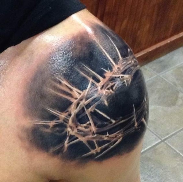 肩部惊人的逼真黑白荆棘刺纹身图案