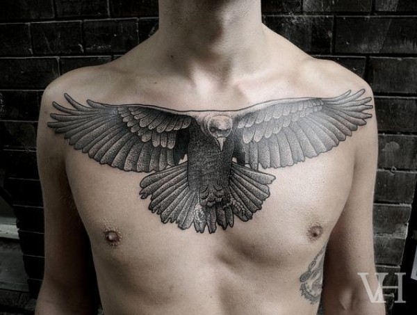 胸部华丽的欧美黑白飞行鹰纹身图案