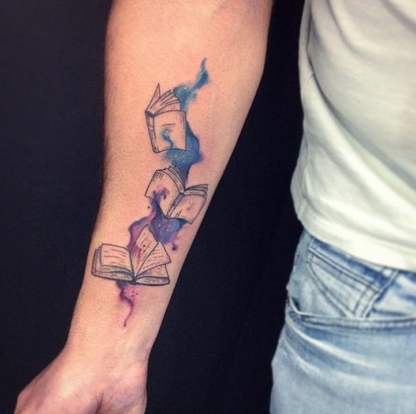 小臂神秘的黑色书与彩色泼墨纹身图案