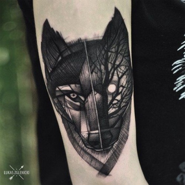 小臂独特的黑色狼头结合森林纹身图案