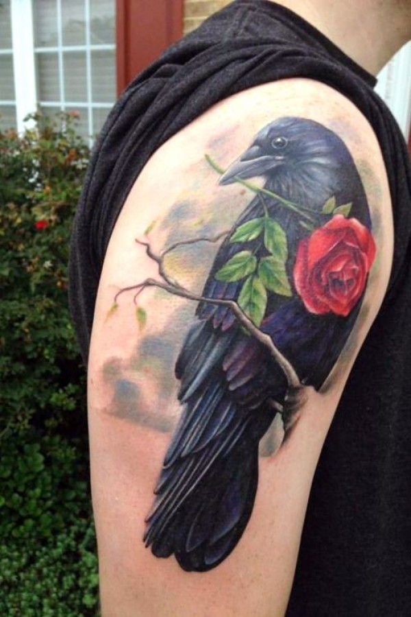 大臂华丽的黑乌鸦与红玫瑰逼真纹身图案