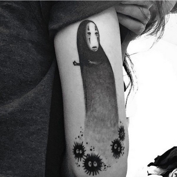 手臂漫画风格卡通无脸男和小煤球纹身图案