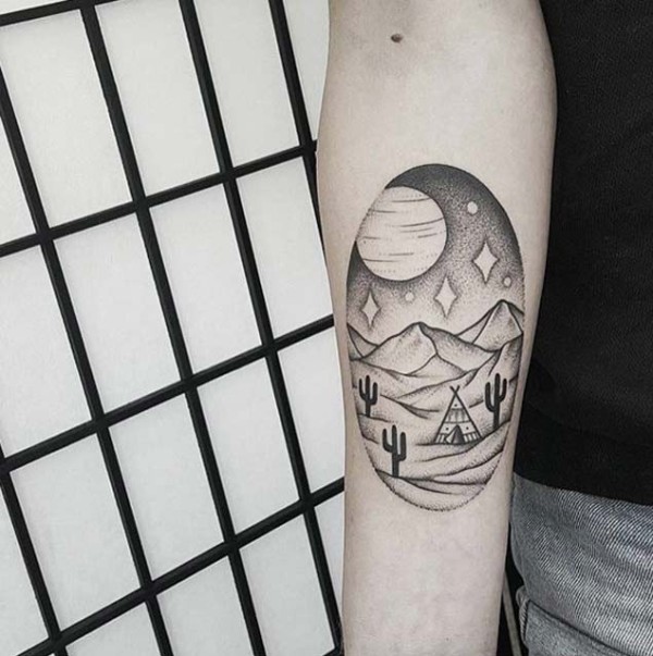 小臂old school黑色椭圆形沙漠风景纹身图案