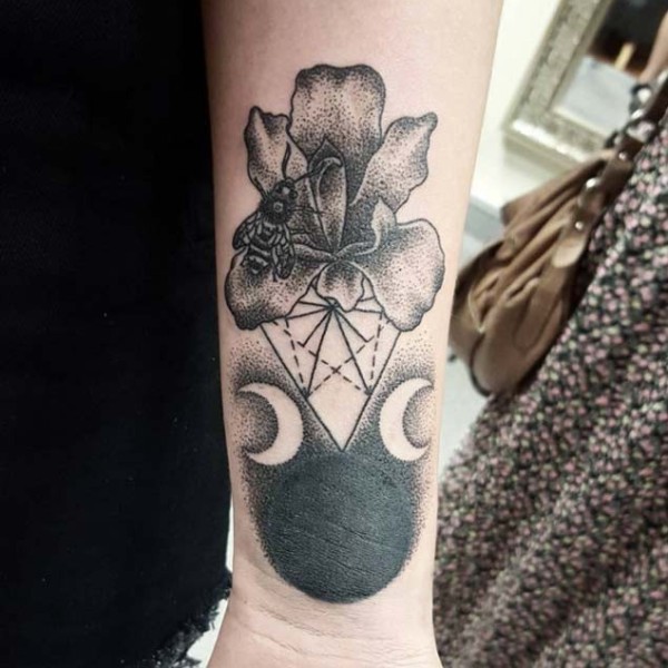 小臂奇怪的结合黑色花朵蜜蜂和月亮纹身图案
