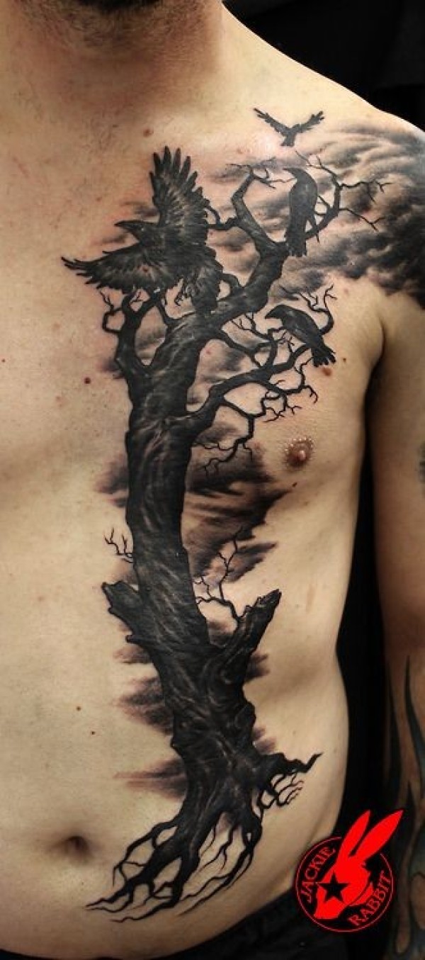 胸部和腹部黑色孤独树与乌鸦纹身图案