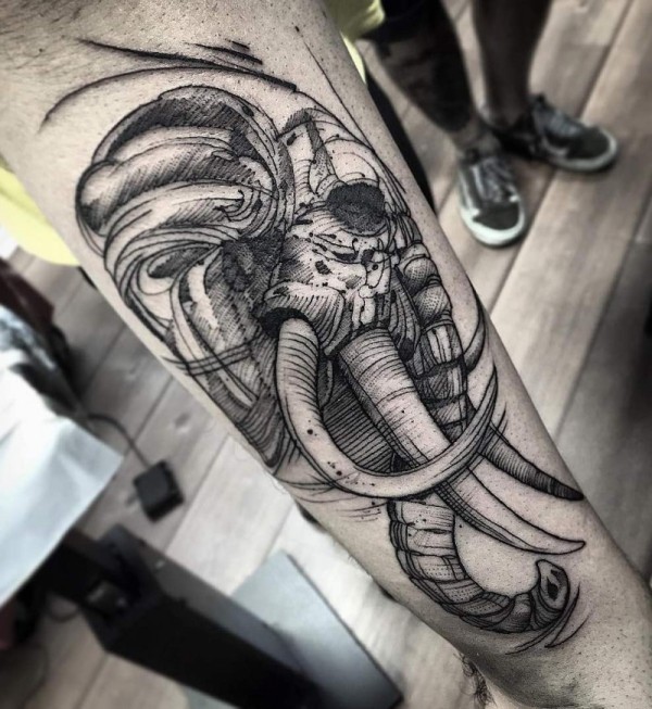 小臂令人印象深刻的黑色线条大象头骨纹身图案