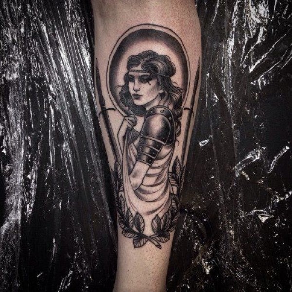 小腿old school黑色中世纪女骑士肖像纹身图案