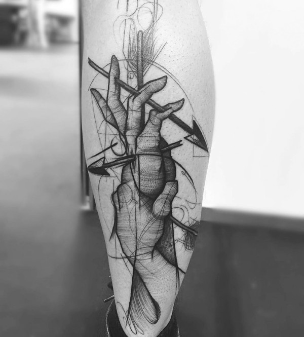 小腿神秘的黑色手与箭头纹身图案