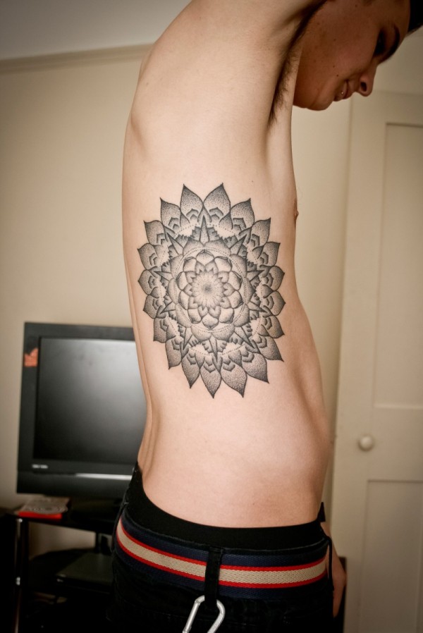 男性侧肋黑色好看的梵花纹身图案