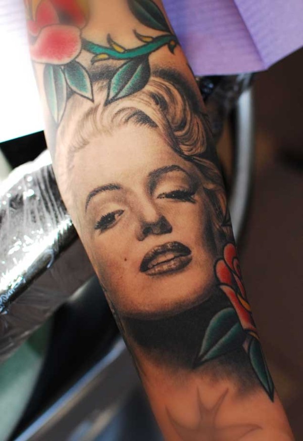 手臂黑色逼真玛丽莲梦露肖像纹身图案