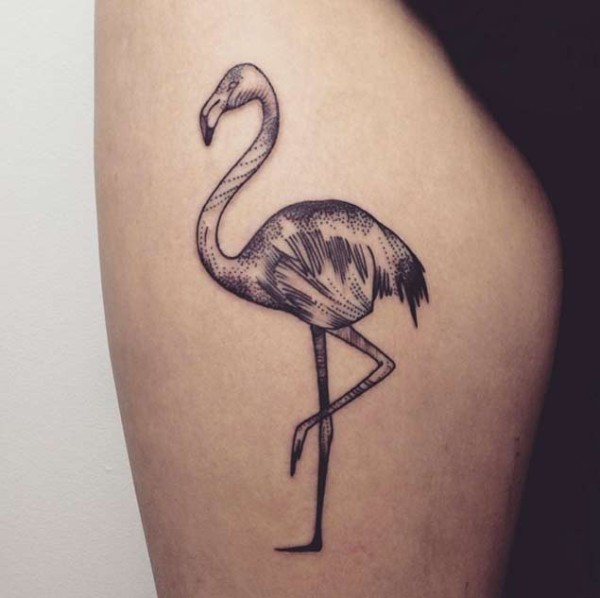大腿old school黑色线条点刺火烈鸟纹身图案