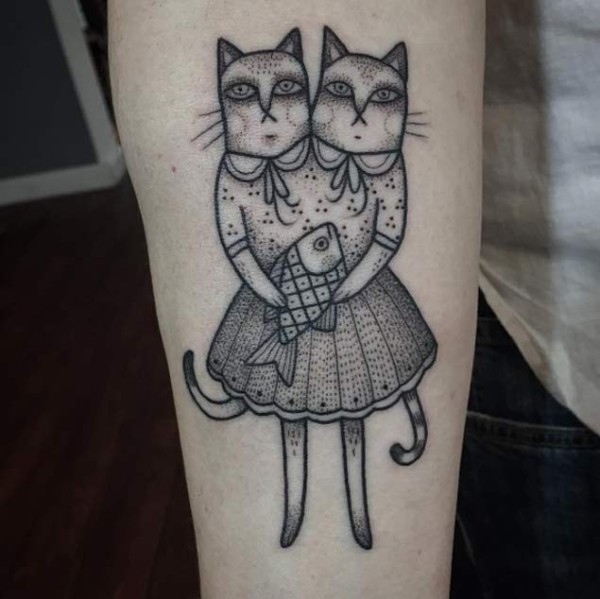 手臂黑色点刺两个头的猫和鱼纹身图案
