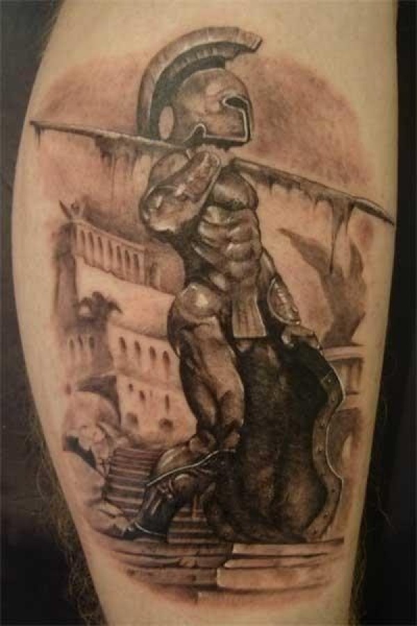 小腿写实黑灰古希腊勇士雕像纹身图案