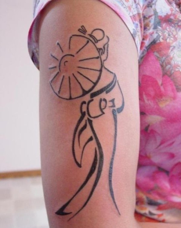 大臂黑色线条艺妓剪影与伞纹身图案