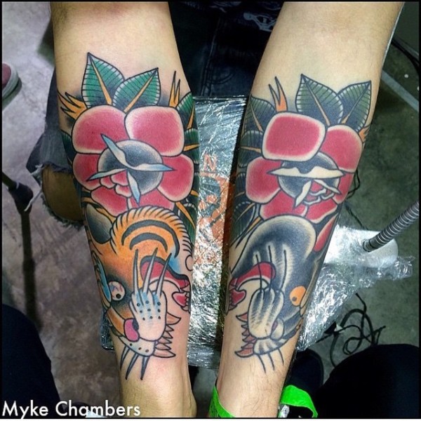 手臂old school彩绘虎老和黑豹花朵纹身图案