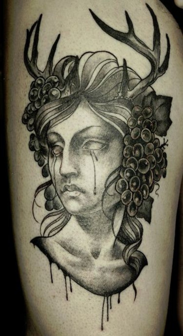 大腿old school黑色哭泣女人肖像和葡萄鹿角纹身图案