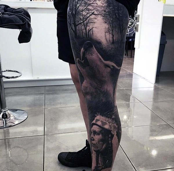 大腿惊人的写实印第安人酋长与森林狼纹身图案