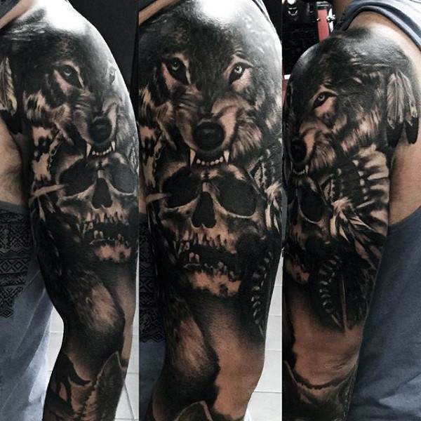 大臂黑色印度骷髅和狼头盔纹身图案
