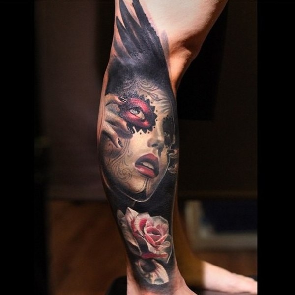 小腿彩绘乌鸦翅膀与墨西哥女性肖像玫瑰纹身图案
