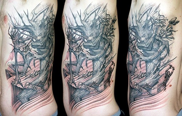 侧肋令人难以置信的黑色妖怪树纹身图案
