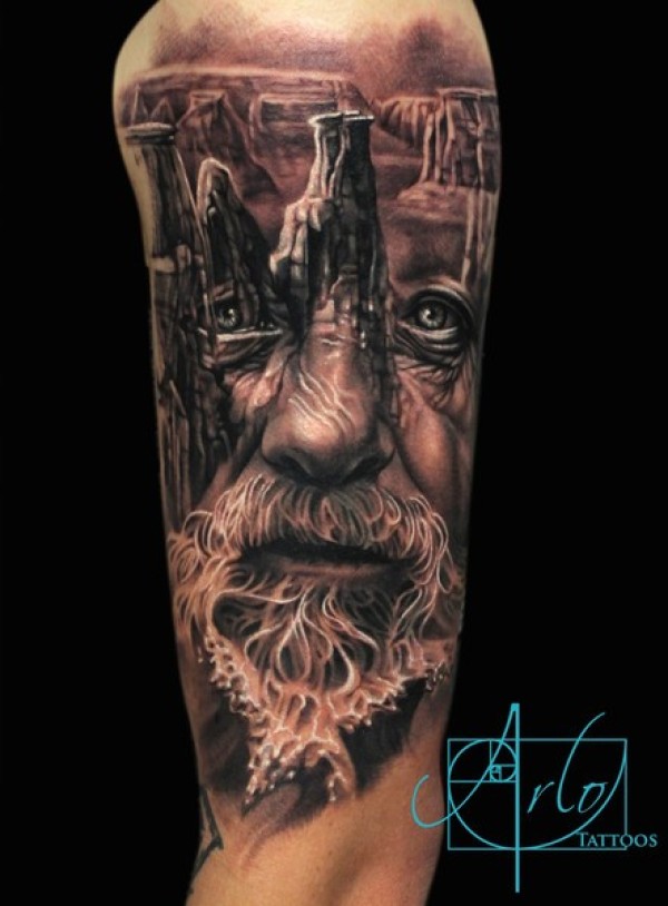 手臂精致的黑灰老巫师肖像与古代遗迹纹身图案