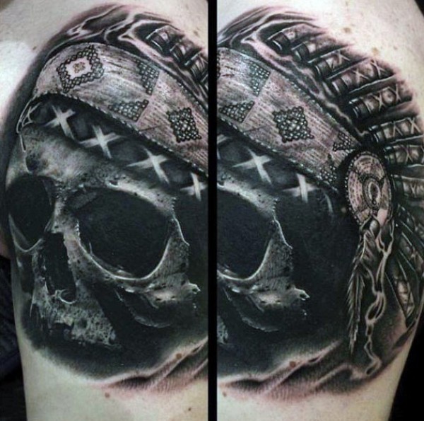黑灰写实风格印度骷髅头盔纹身图案