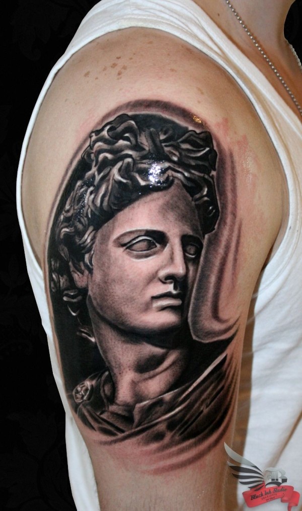 大臂写实个性的黑灰雕像纹身图案