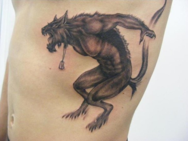 侧肋独特的黑灰幻想咆哮狼人纹身图案