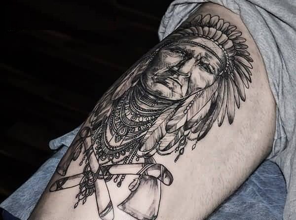 大腿黑灰印度肖像个性纹身图案