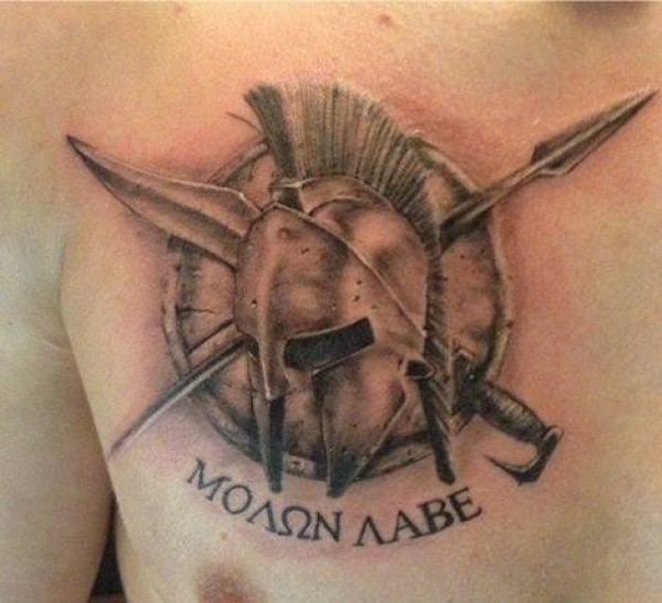 胸部黑色斯巴达头盔与交叉武器纹身图案
