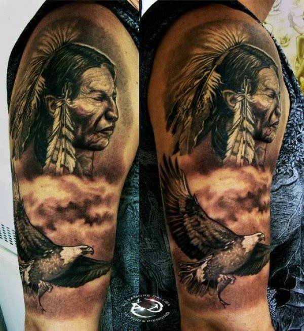 手臂黑灰古老的印度人像和鹰纹身图案