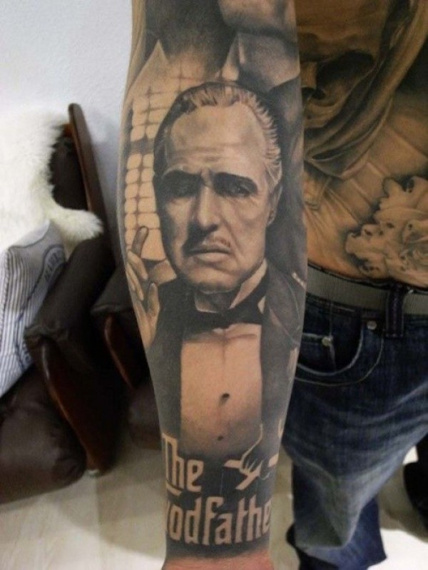 大臂令人印象深刻的黑白男性肖像与字母纹身图案