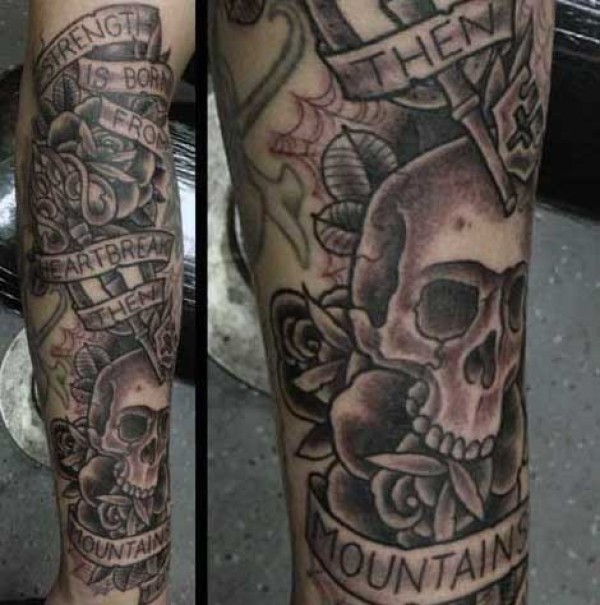 old school腿部黑灰字母和钥匙骷髅纹身图案