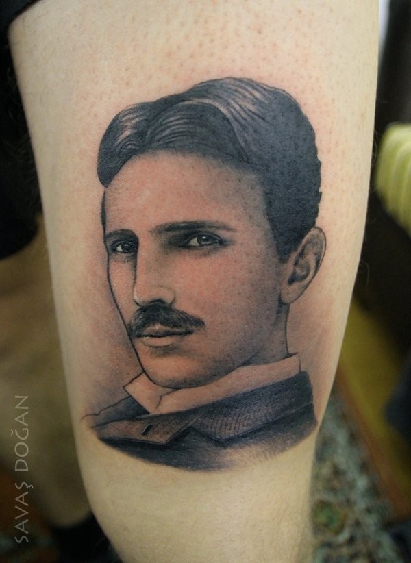大腿令人难以置信的黑灰写实年轻男子肖像纹身图案
