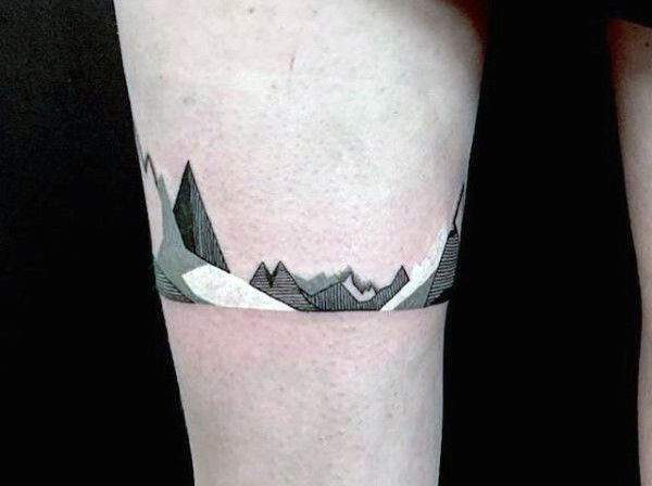大腿简单的黑白灰相间山脉纹身图案