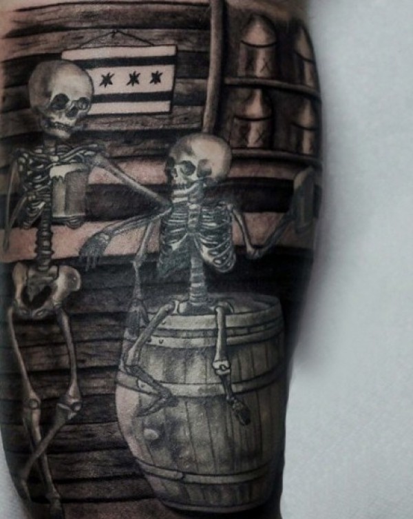 大腿印象深刻的黑灰骨架与啤酒纹身图案