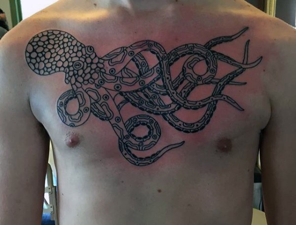 胸部简单的黑色线条章鱼纹身图案
