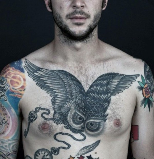 胸部黑灰猫头鹰与钥匙和时钟纹身图案