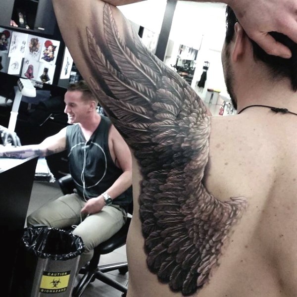 背部和手臂印象深刻的写实黑灰翅膀纹身图案