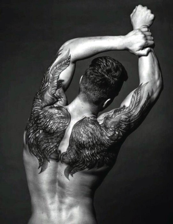 背部和手臂惊人的写实黑灰翅膀纹身图案