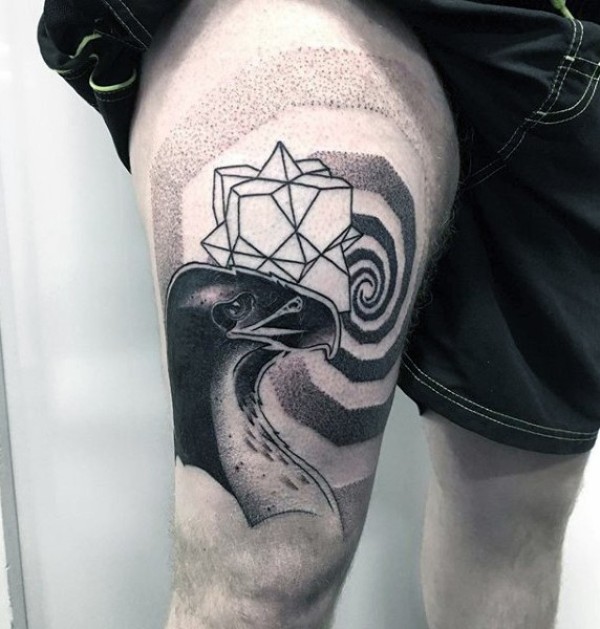 大腿黑色点刺漩涡和鹰头纹身图案