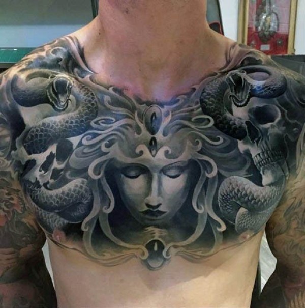 胸部梦幻般的蛇黑白美杜莎肖像纹身图案