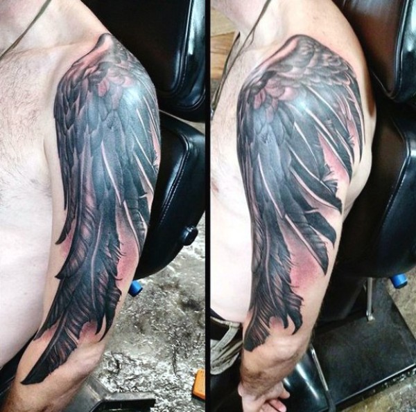 肩部和手臂好看的黑灰翅膀纹身图案
