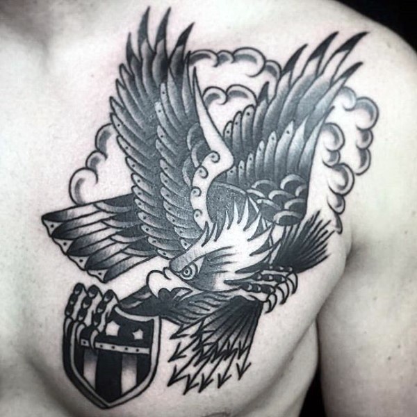 胸部幻想黑灰鹰与盾牌和箭纹身图案