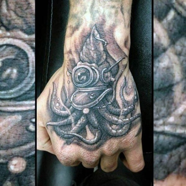 手背有趣的手绘黑灰鱿鱼潜水员纹身图案