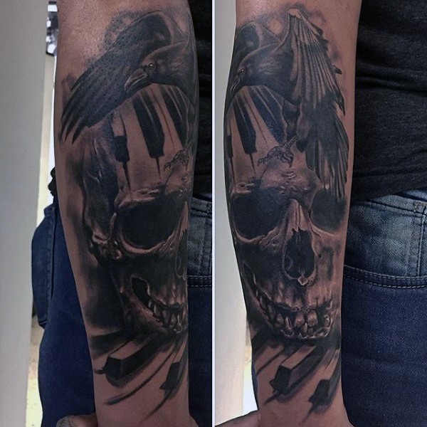 手臂黑灰乌鸦与骷髅和钢琴键纹身图案