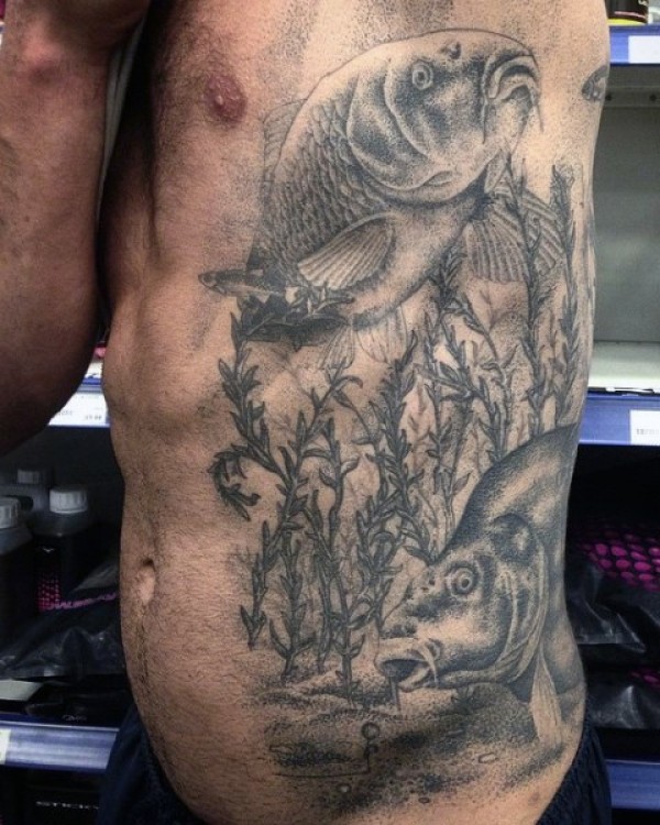 侧肋非常逼真的黑灰水底鲤鱼纹身图案