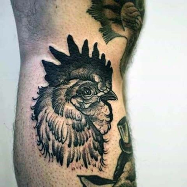 小腿黑白公鸡头部纹身图案
